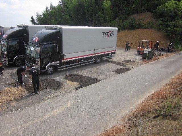 当日は真夏の天気の中、スタッフ総勢、60余名で、事務所の掃除や駐車場の草刈り、整地を行いました。