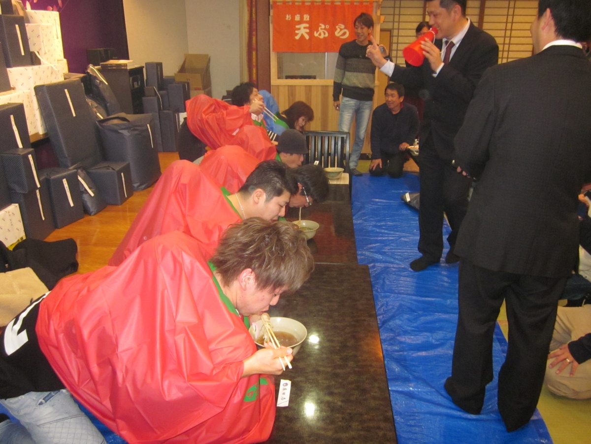 二人羽織りでは熱々のうどん早食いをしてもらい、二人の掛け声や食べる姿に会場は笑いの渦となりました!