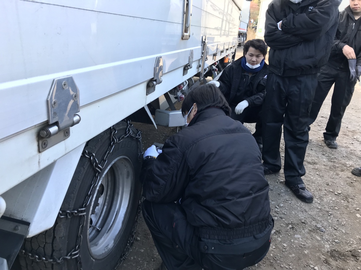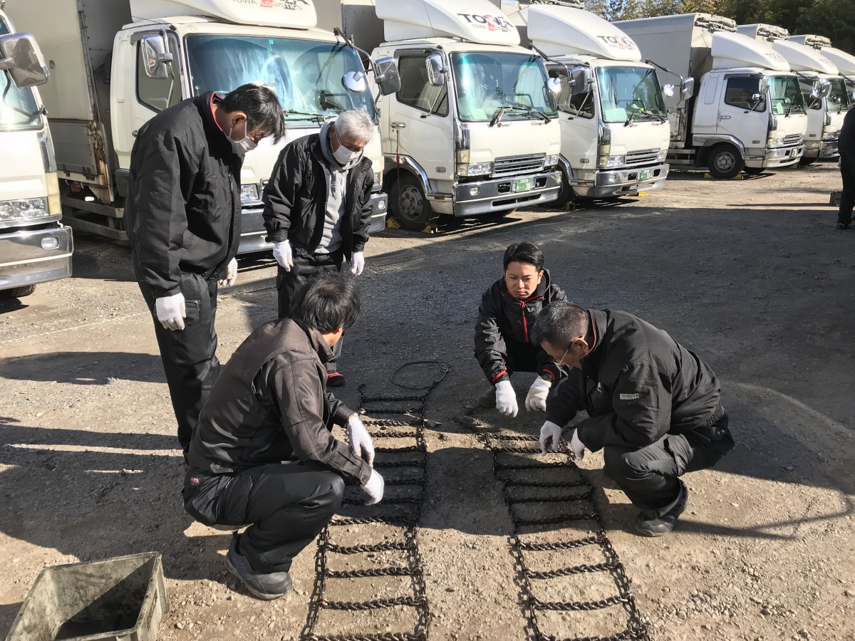 去る12月9日(土)、新人ドライバー8名を対象に毎年実施している雪に備えてのチェーン講習会を行いました。