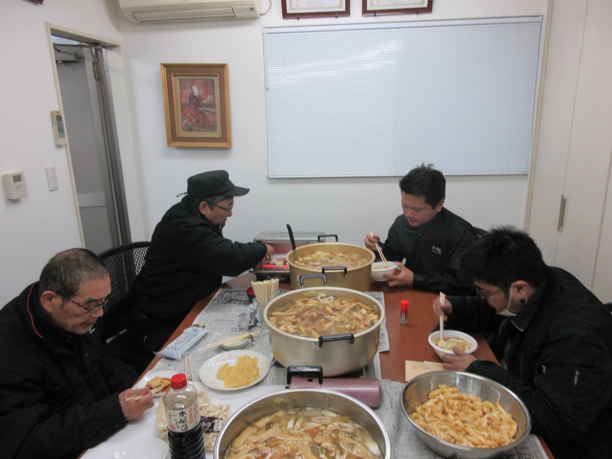 お雑煮、おしるこ、うどんを事務員の方に朝から準備をしていただき