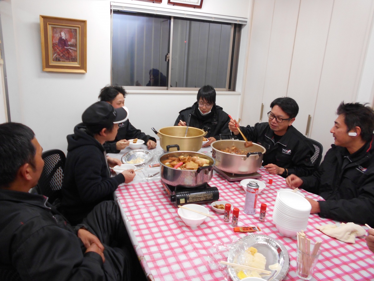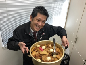 事務所の駐車場に着くとおでんのにおいがして、そこからもう会話の始まりです。