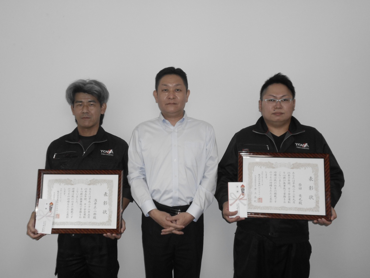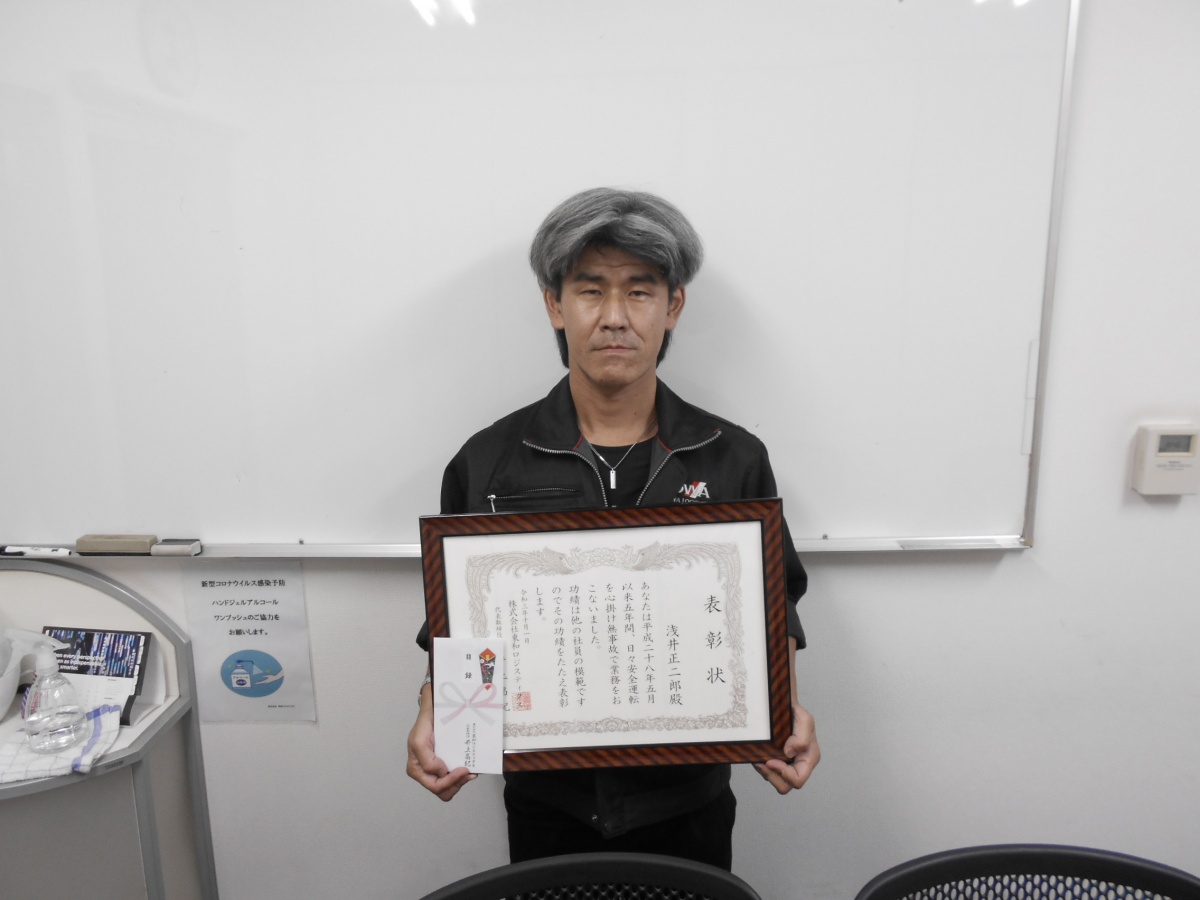 去る、10月1日に交通事故無事故継続者の表彰を行いました。