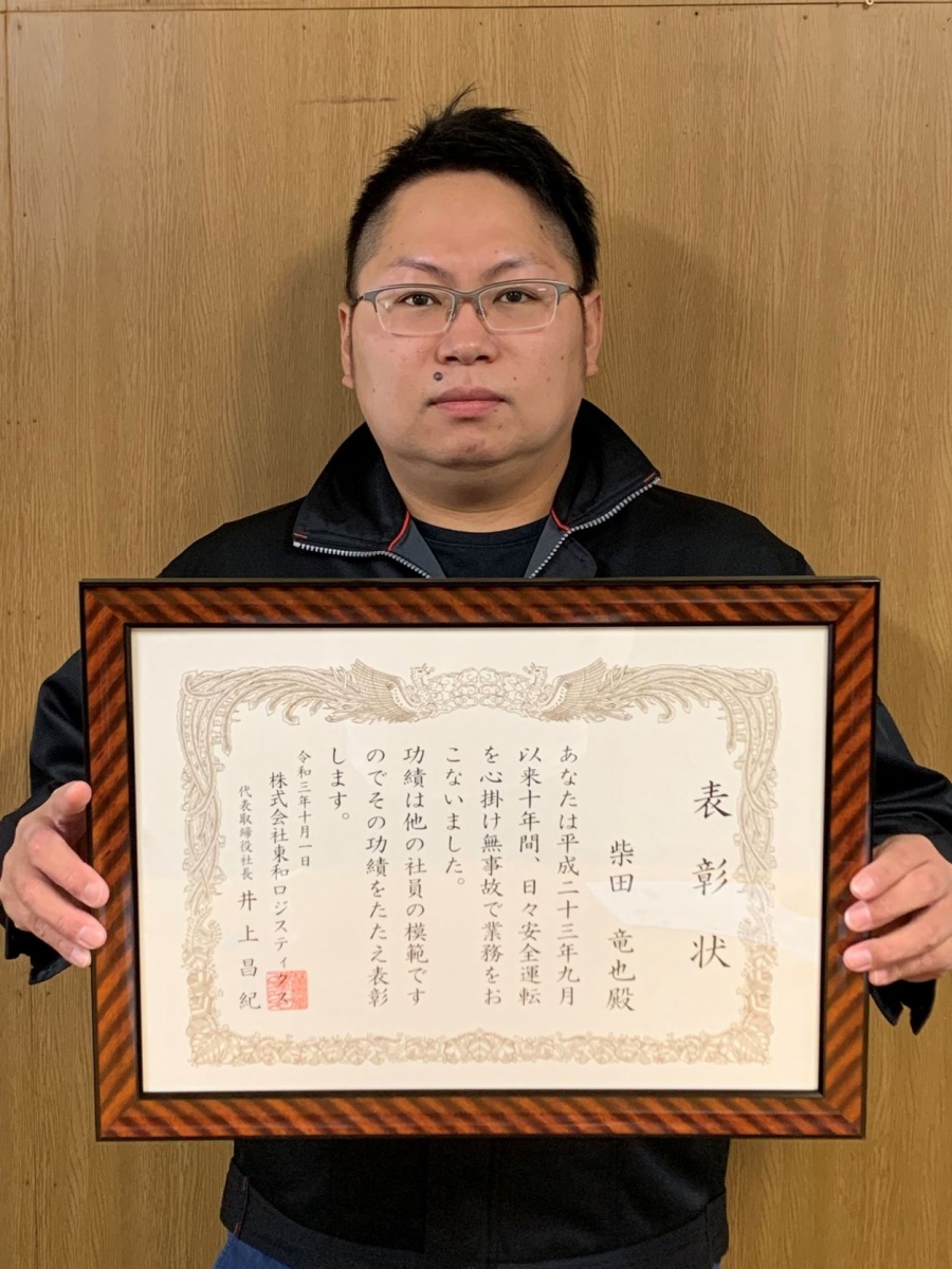 10年前に追突事故をお起こしてしまい、その反省を踏まえ、日々安全運転に取り組んでこられました。さらなる今後の活躍を期待しています。