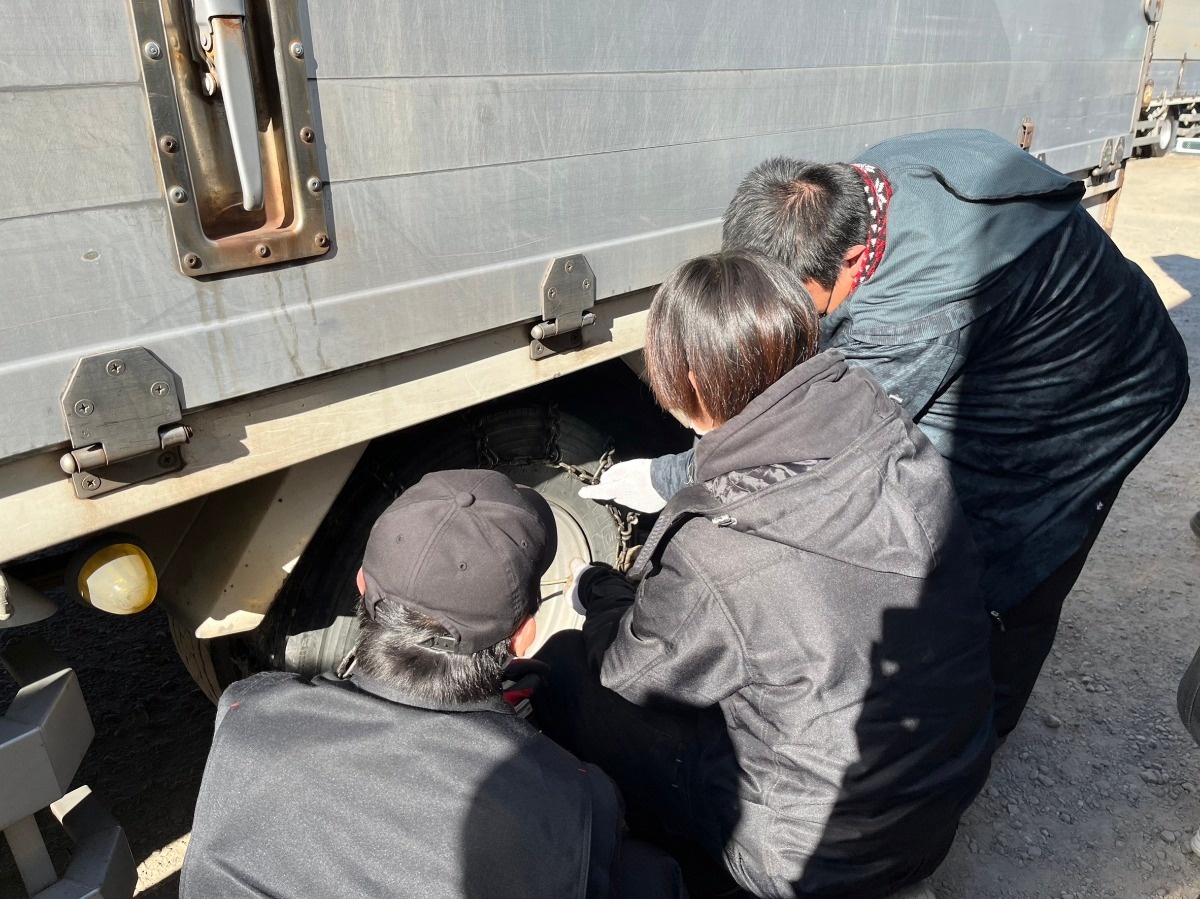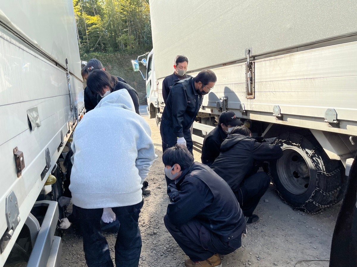 弊社では、入社1年未満の社員にチェーン装着の実習の講習をしています。先輩に講師をしてもらい、手本を参考に装着を実際にやってもらいます。